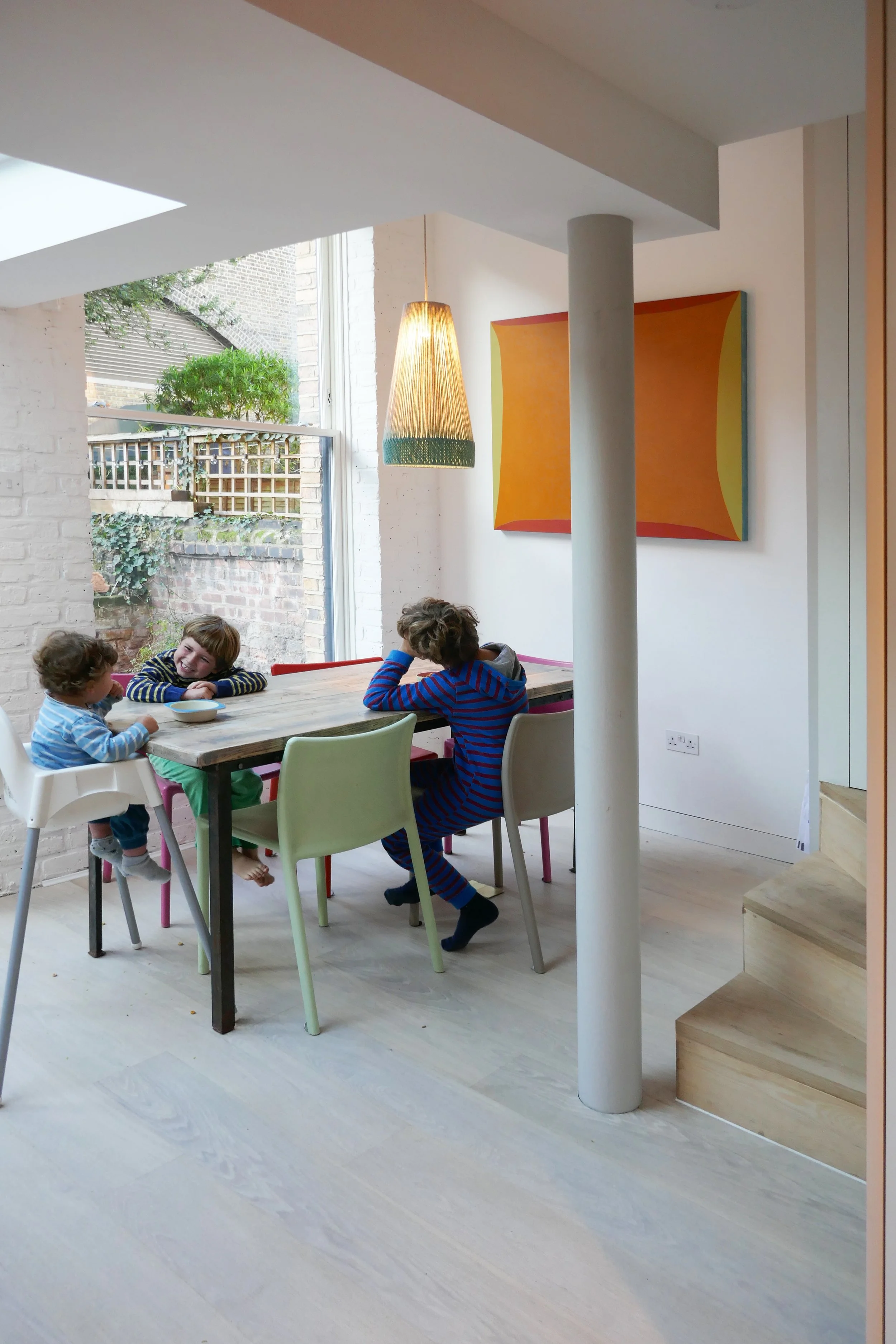 The house is now fully insulated, mostly internally to preserve the brick façade in this conservation area. A highly efficient boiler has been installed, underfloor heating added, and retractable external blinds provide shading in summer and insulation at night. Rooflights increase natural daylight, and wiring has been installed for future PV panels.